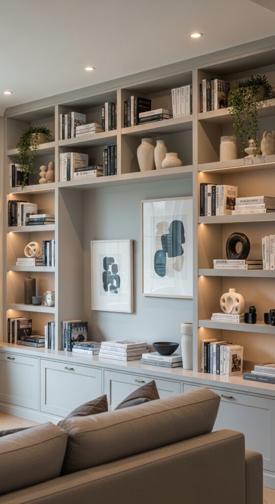 Built-in shelving uses vertical space efficiently and adds architectural character. Unlike freestanding bookcases, built-ins look like they belong in the home. This project works in living rooms, home offices, dining rooms, and bedrooms.