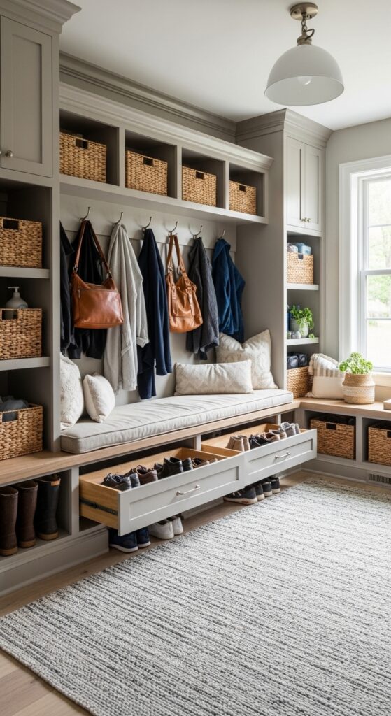 A well-designed mudroom stops clutter at the door. This transition space between outdoors and indoors keeps the rest of your home cleaner and more organized. Every family needs a designated spot for shoes, coats, and bags.