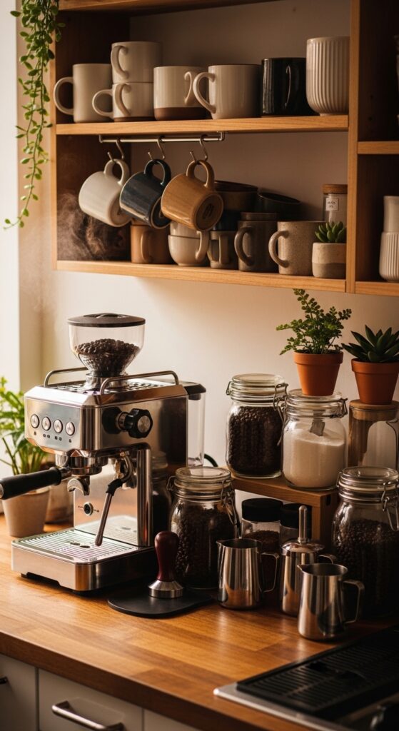 Convert a small cabinet area or unused corner into a beverage hub. Include an outlet for your machine, shelving for mugs, and storage for supplies. Built-in options cost $800 to $2,500. DIY countertop stations using a small cabinet or cart cost $100 to $400.